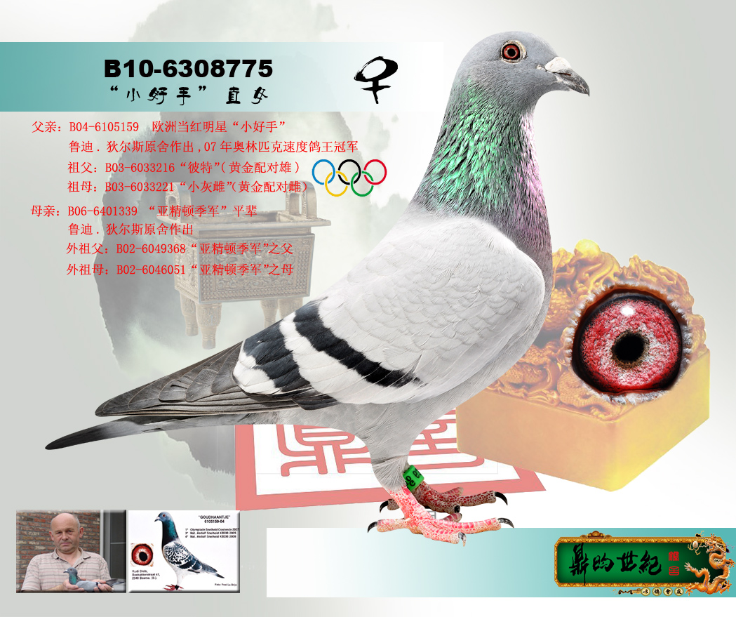 鲁迪.狄尔斯原舍作出,欧洲当前炙热铭鸽“小好手”作出。“小好手”荣获07年奥林匹克速度鸽王冠军、05年KBDB速度鸽王全国3位、06年KBDB速度鸽王全国4位、获冠军5次、亚军4次、季军2次。