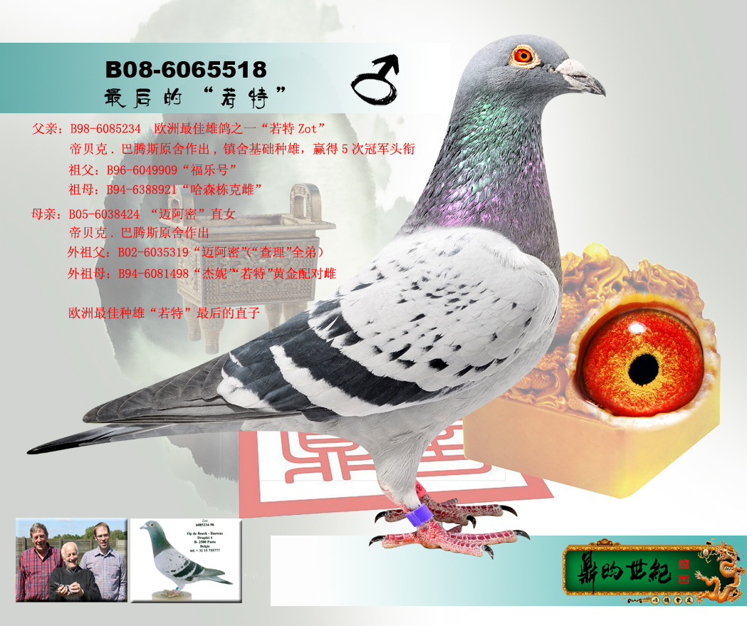 “若特Zot”是巴腾斯鸽舍镇舍基础种公,还是朱尔斯在世时作翔的。“若特”曾赢得5次冠军头衔,12次入赏强10强,是曾祖父留给后代们的宝贵遗产。“若特”代表直孙“拉比若特”(Rappe Zot)获2009年全国波治II一岁鸽冠军!“若特”的后代被很多欧洲现役强豪争相引进,如凡代克、雅克布等。
