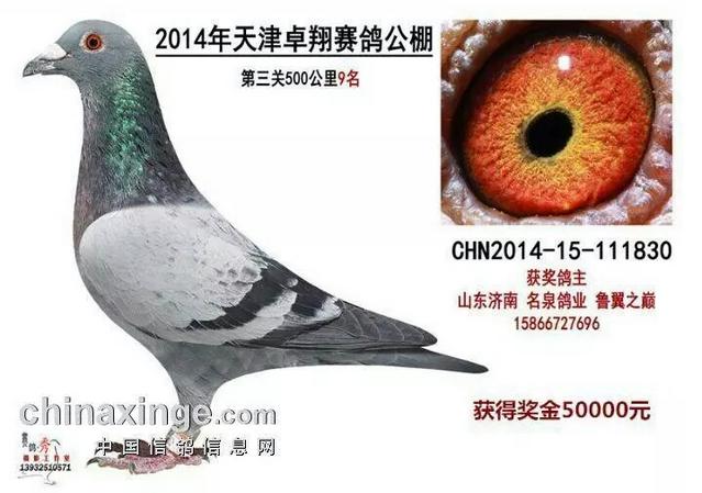 赛绩:2014年秋天津卓翔公棚520公里决赛九名,本届前十名中唯一一羽雄鸽!