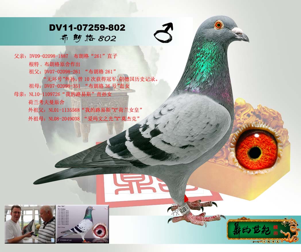 2008年根特.布朗格以一羽环号为“DV07-02098-261”的雨点雄鸽获得10次比赛冠军,打破德国历史记录。其子代价格预付10万元都订不到,真正是一羽难求的超级种鸽。