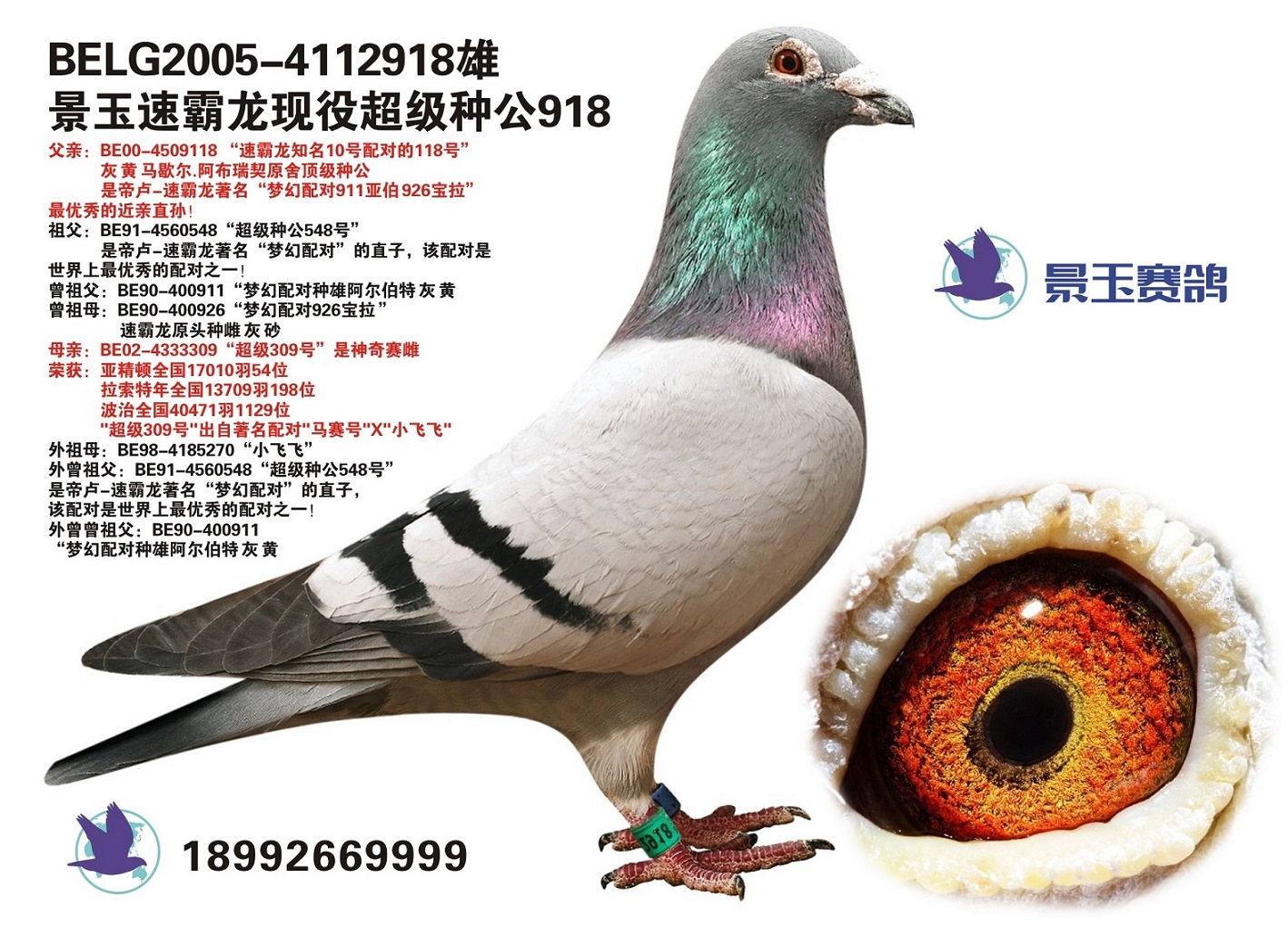 - 父亲“超级种公548/91号”(帝卢-速霸龙原舍鸽)是超级种公,优秀直子代代表及佳绩: