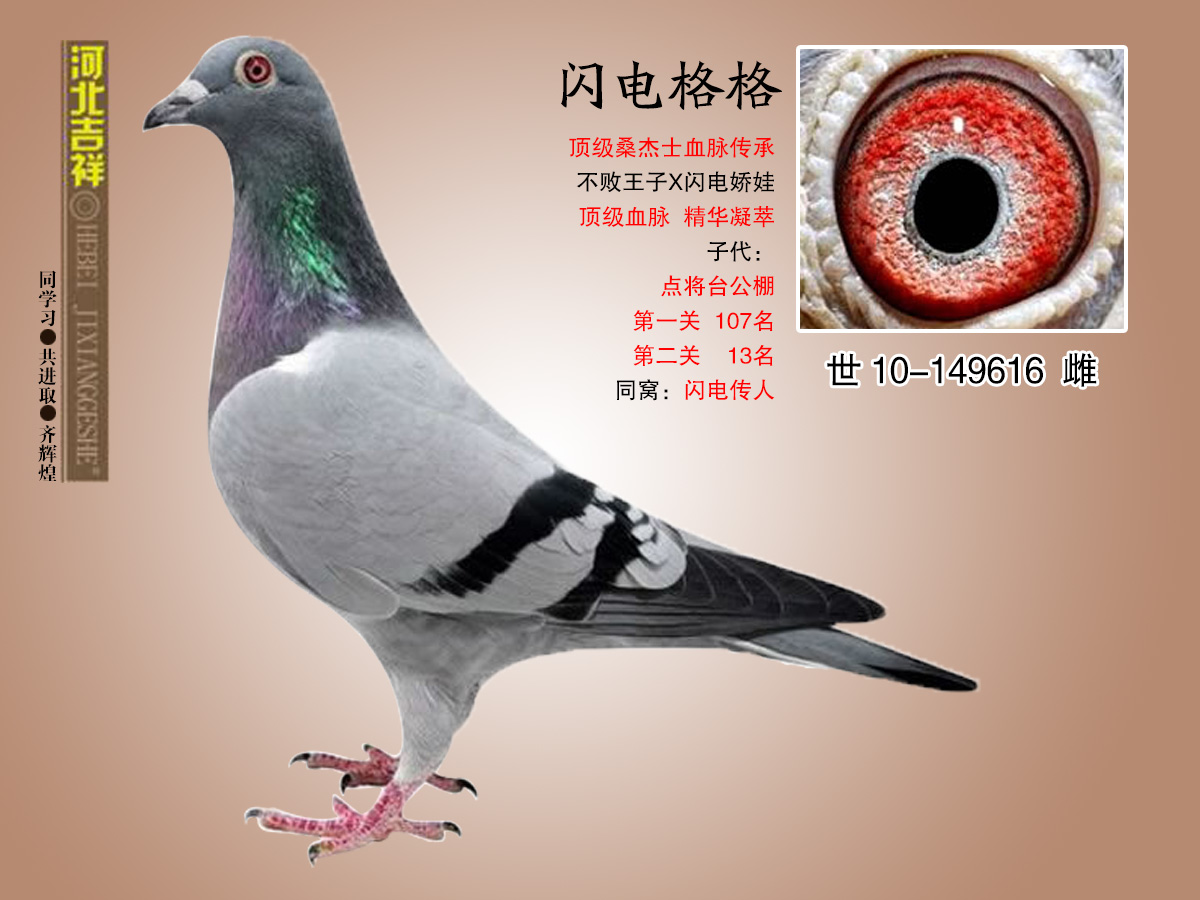 次轮交配种雌“皮特公主” ,作育翼展俱乐部300公里冠军;五关综合鸽王总冠军等; “皮特公主”本身为大名鸽“皮特号”近亲血系,本身作育后代成绩突出,全距离、各赛项均获佳绩,堪称完美。作育出260公里冠军;300公里冠军;350公里冠军;500公里冠军;700公里亚军;本次再次作出冠军鸽延续辉煌!