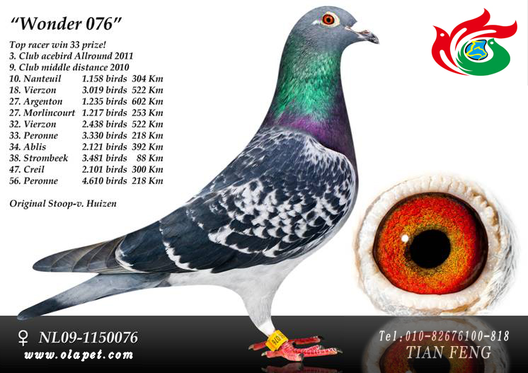 赛绩:2010年中距离鸽王9名; 2011年全距离鸽王3名 本身33次获奖; 荷兰2011年NPO奥尔良全国冠军得主