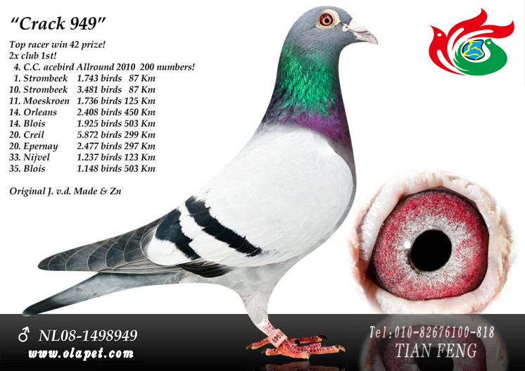 赛绩:2010年鸽王4名,参赛评选人数200; 本身两次冠军,42次获奖; 2011年全荷兰WHZB全国鸽王3名得主