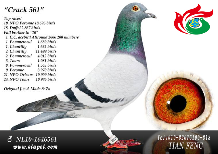 赛绩:本身获得NPO全国18695羽全国10名 全兄弟8次获得前10名全距离鸽王冠军; 2011年全荷兰WHZB全国鸽王3名得主