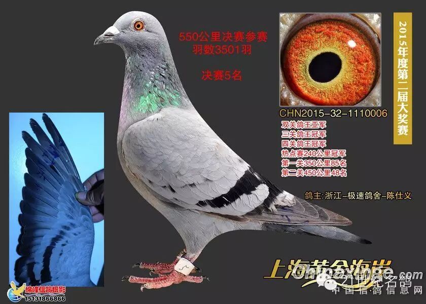 回顾15年的上海黄金海岸公棚比赛,最大的赢家莫非“陈仕义”,其不但拿下三关鸽王总冠军,而且还赢得了通指大满贯。为陈仕义夺得鸽王的的赛鸽,其环号为2015-32-1110006,第一关分速 1051.585148米/分,排名85;第二关分速971.6084153米/分,排名48;第三关分速为1284.502162米/分,排名第一;综合分速为3307.695726米/分,三关鸽王冠军。