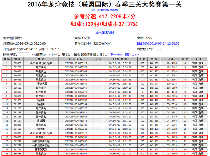 2016年龙湾竞技(联盟国际)俱乐部春季三关大奖赛第一关,于2016年5月11日集鸽,5月12日早晨6:20分在厦门翔安放飞,共计372羽赛鸽参与竞翔,司放地坐标: 北纬:24°34′59″ 东经:118°16′1″。