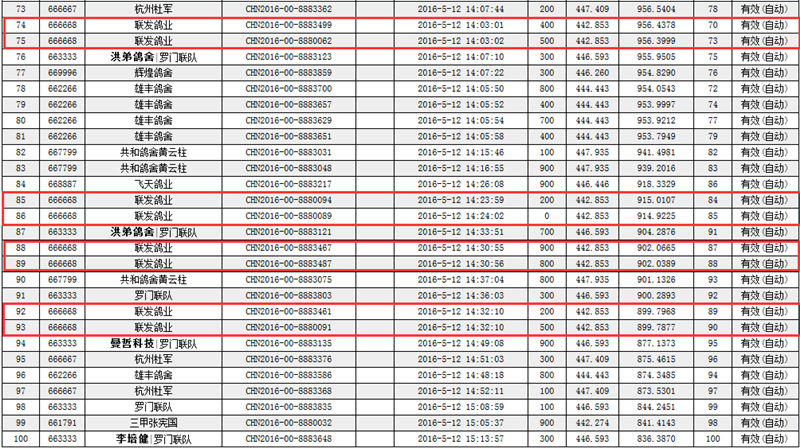 中午接近1点时分,赛鸽开始陆续归巢,最高分速1124.4190米,联发信鸽在本次比赛中非常给力,分别获得第3名、4名、5名、7名、9名等优秀成绩;其中前10名进5羽,前100名进35羽。受天气影响当日共计归巢128羽,联发信鸽就占有42羽,指定鸽奖金包揽80%左右。其中,联发信鸽一羽(足环号:CHN2016-00-8884934)赛鸽,在本场比赛一举夺得16项指定冠军,为鸽主立下悍马功劳。