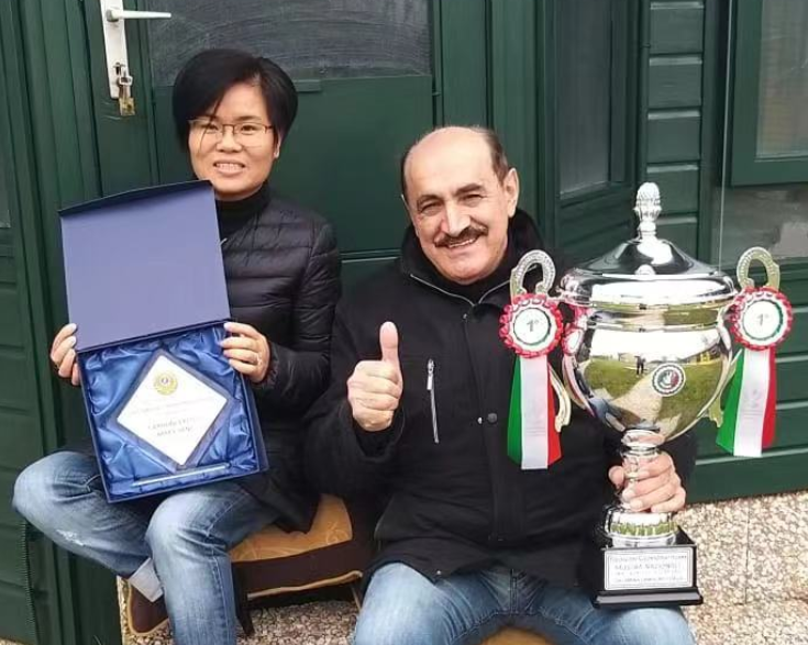 合作者旭霞女士手捧2018年意大利国家赛冠军奖杯