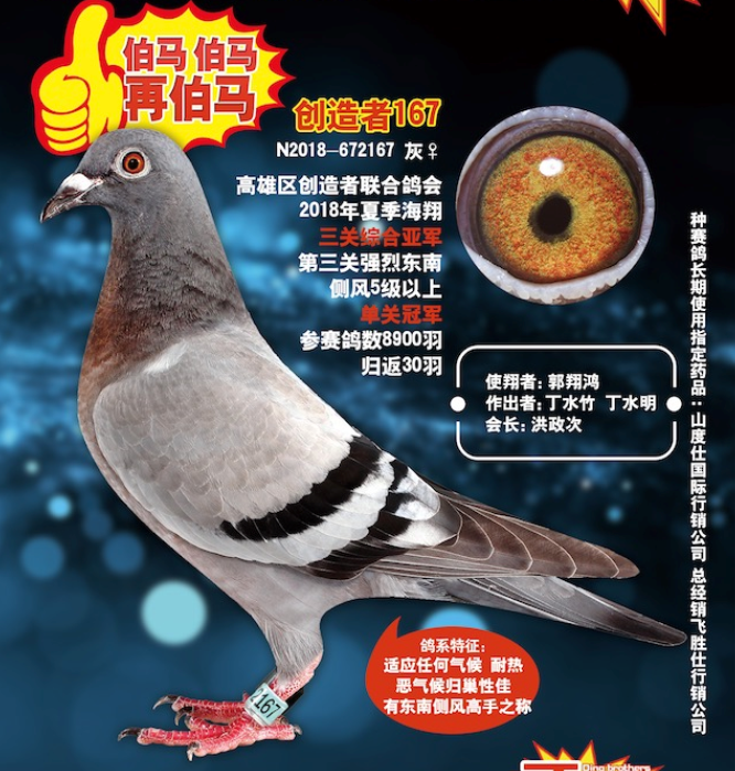 - 赛绩:高雄区创造者联合鸽会2018年夏季海翔三关综合亚军、第三关强烈东南、测风5级以上、单关冠军,参赛羽数8900羽,归返30羽