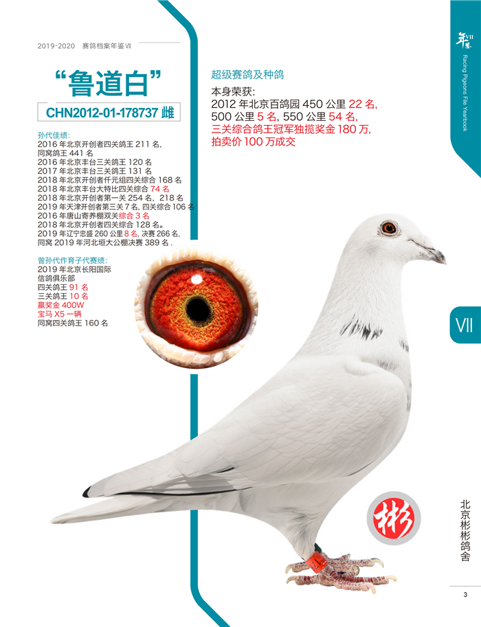 - 赛绩:2012年北京百鸽园450公里22名, 500公里5名,550公里54名, 三关综合鸽王冠军