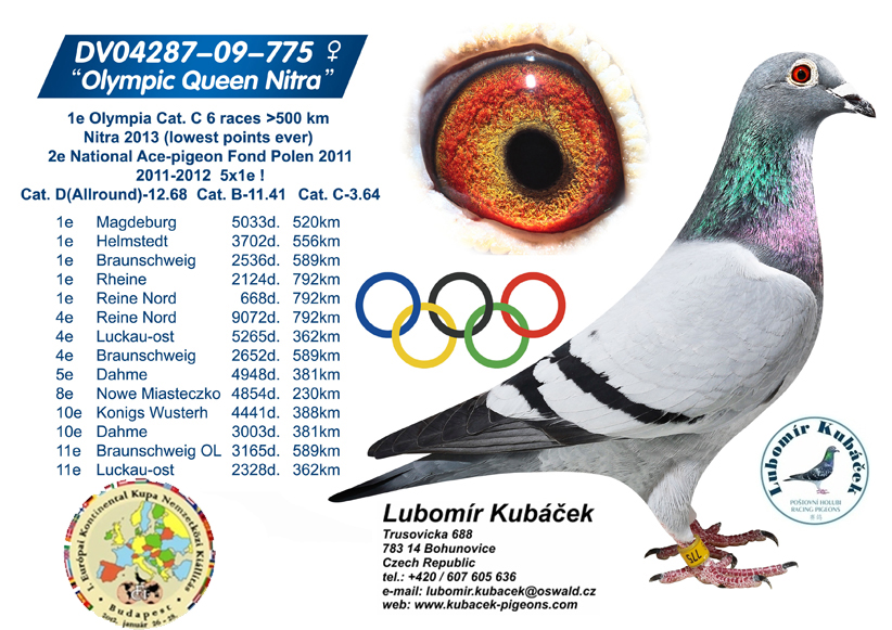 - 赛绩:尼特拉奥林匹克当日归长途国际鸽王冠军、波兰全国长距离鸽王亚军,2011年-2012年5次鸽王冠军